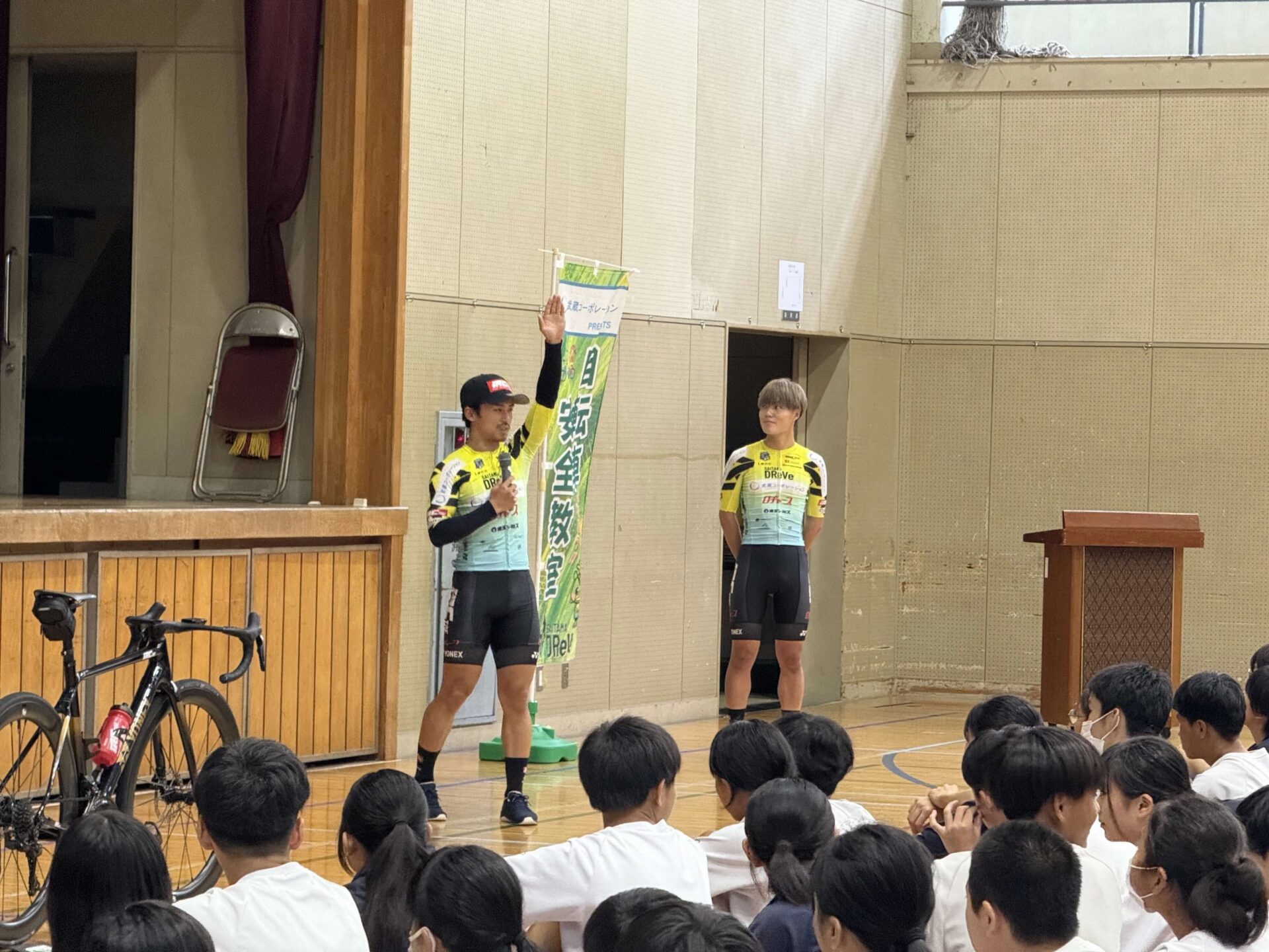 武蔵コーポレーション様のご協力のもと、さいたま市教育委員会と連携し、「さいたまディレーブ」の選手が講師を務める「武蔵コーポレーションpresents自転車安全教室」。